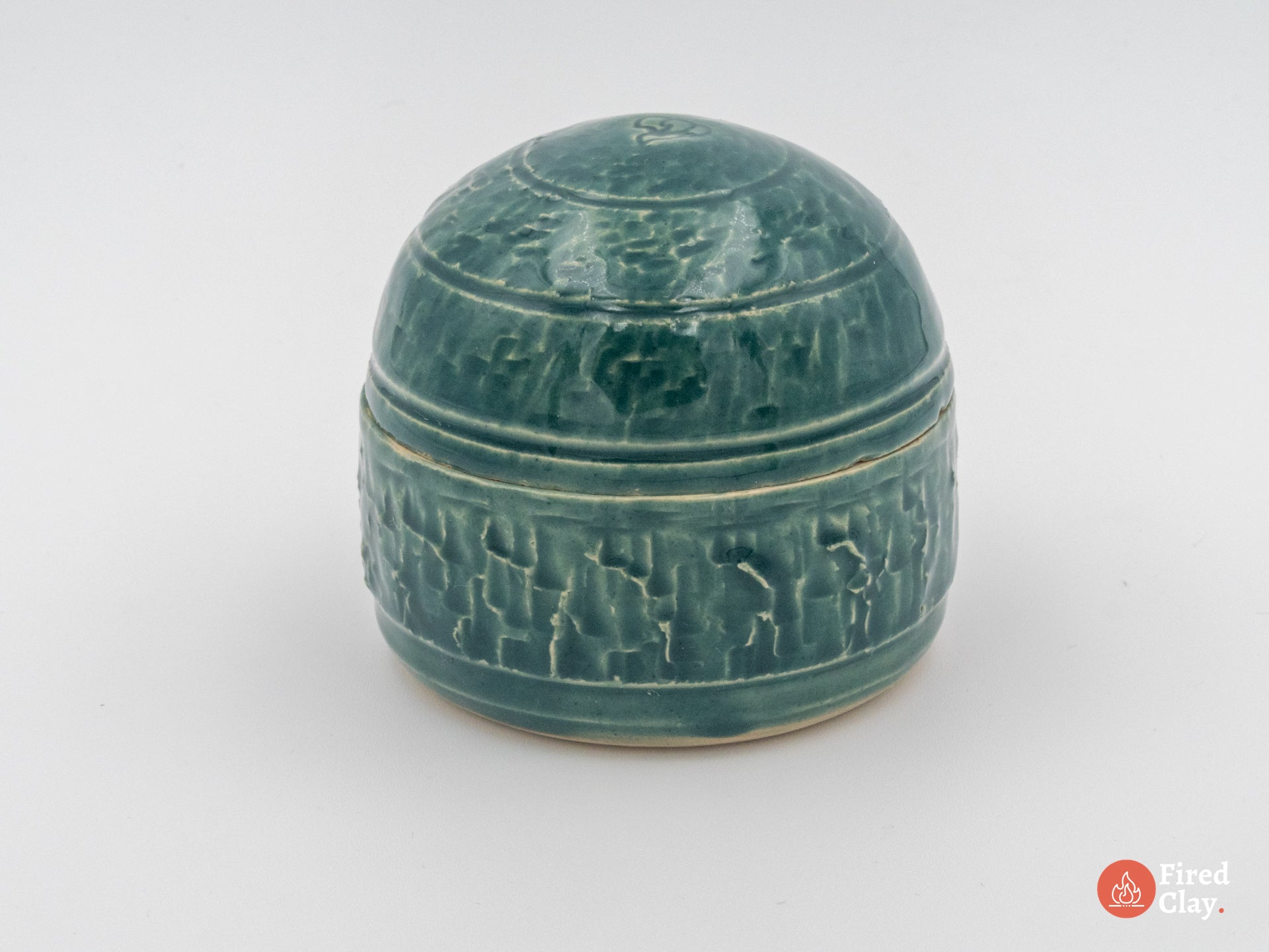 A small closed form lidded jar, or circular box-jar with a chattering texture in a celadon green glaze
