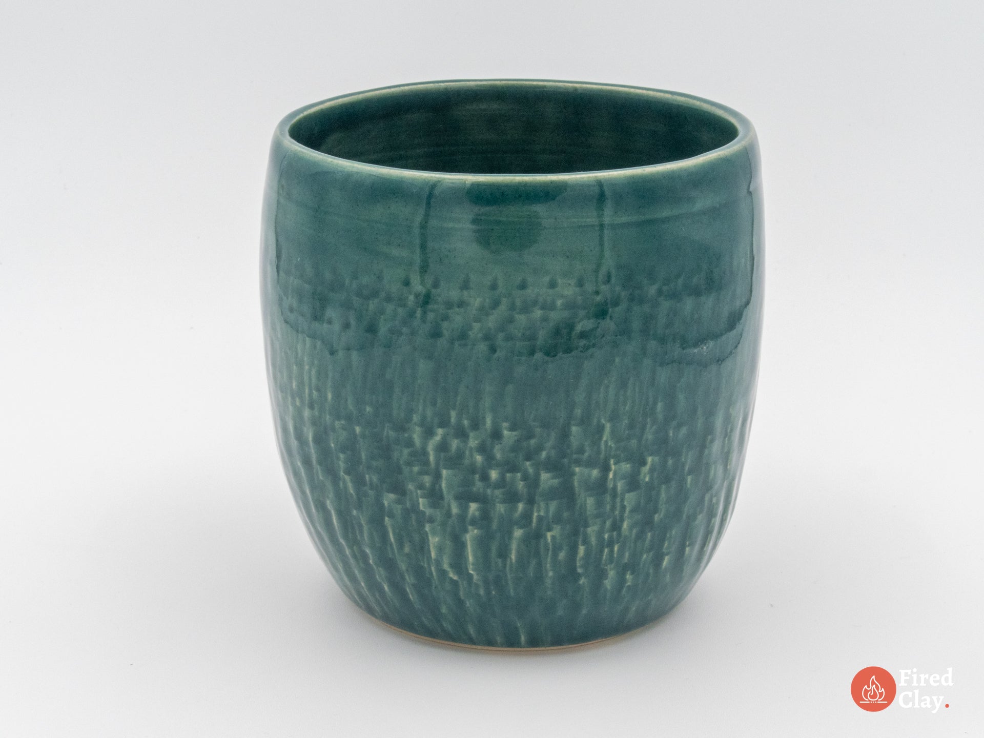 A medium sized vessel for use as a vase or planter sleeve or just as decoration, with a chattered texture finished in our green celadon glaze. The piece is approximately 11cm in diameter and 12cm tall.